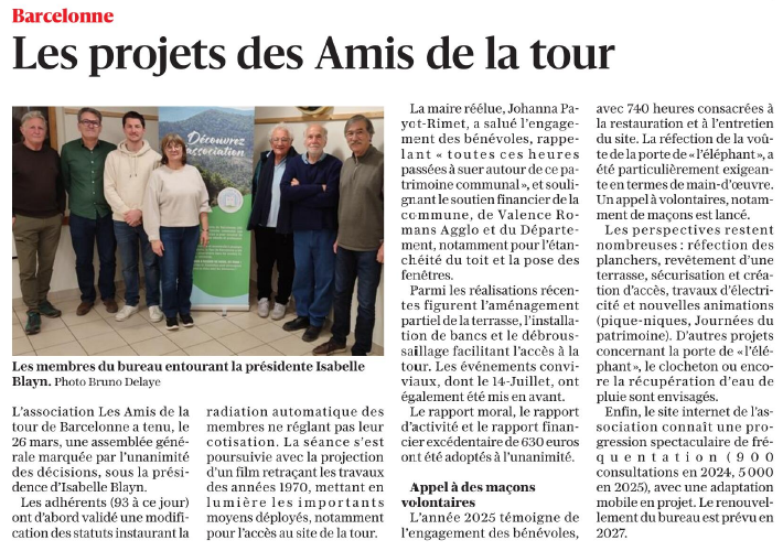 Ce 28 mars 2026 est paru un article de Bruno Delaye, journaliste pour le Dauphiné Libéré, sur les assemblées, générale et extraordinaire, qui se sont déroulées le 26 mars à la salle communale de « La Bergerie ». Les adhérents présents et représentés, au nombre de 48, ont pu assister à la rétrospective de l’année 2025 et s’exprimer librement sur les projets en cours pour 2026 et sur les projets futurs de l’association qui devrait dépasser les 100 adhérents cette année.